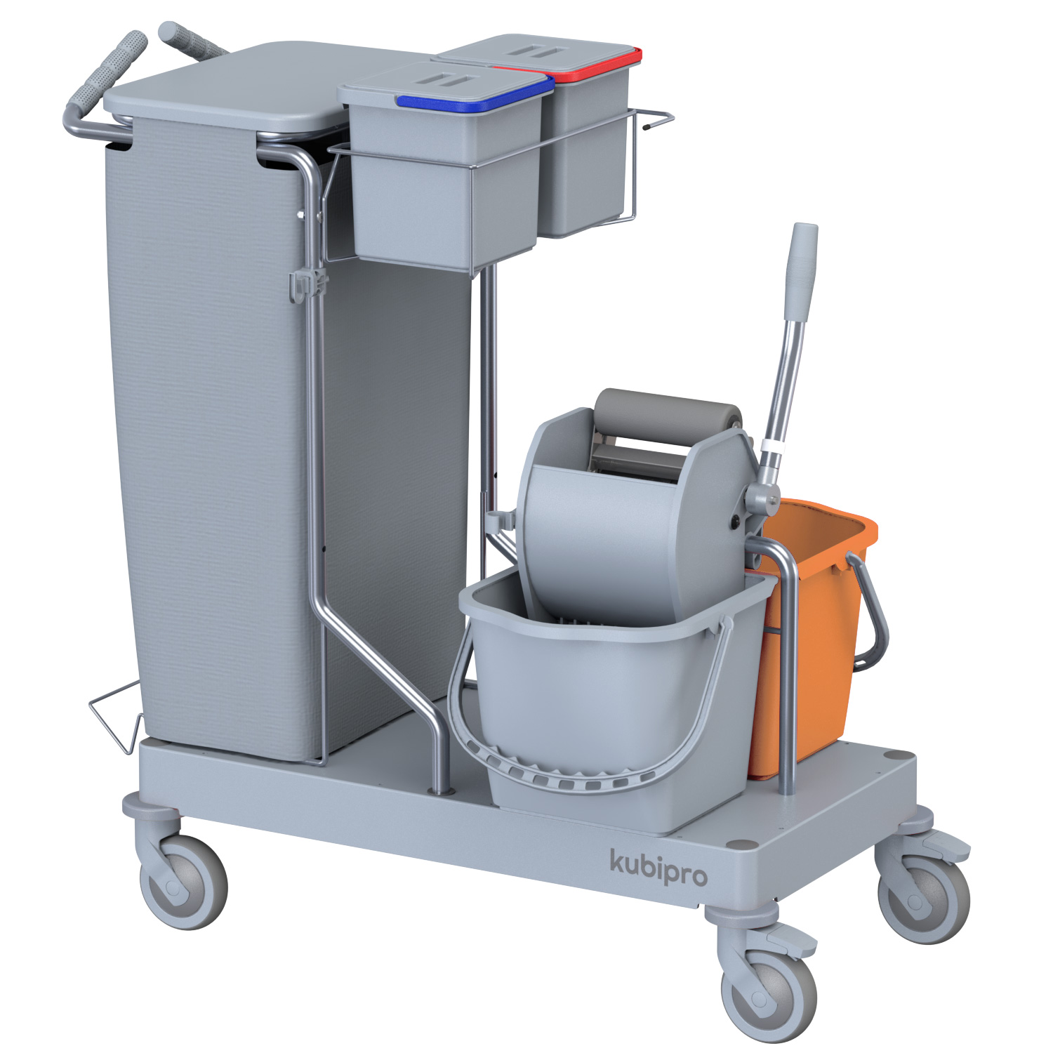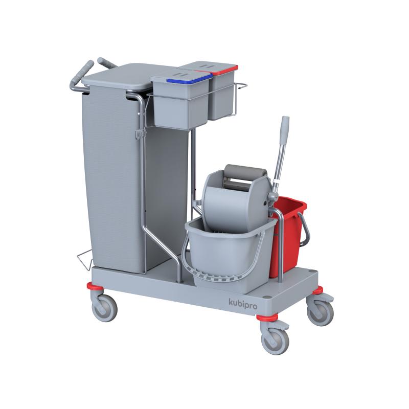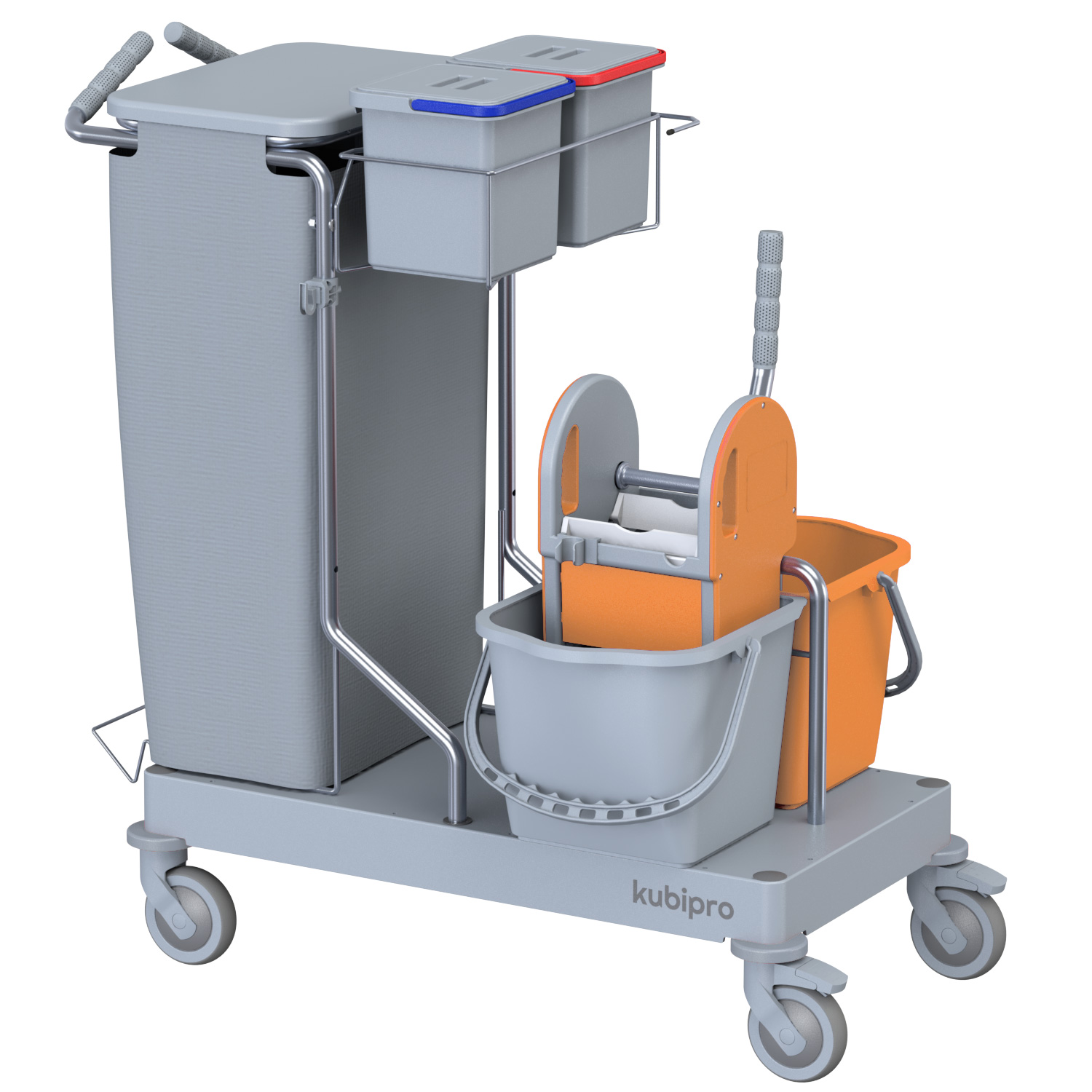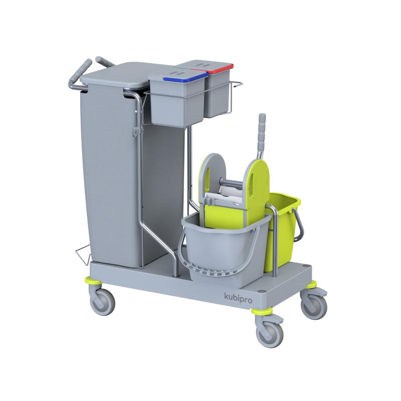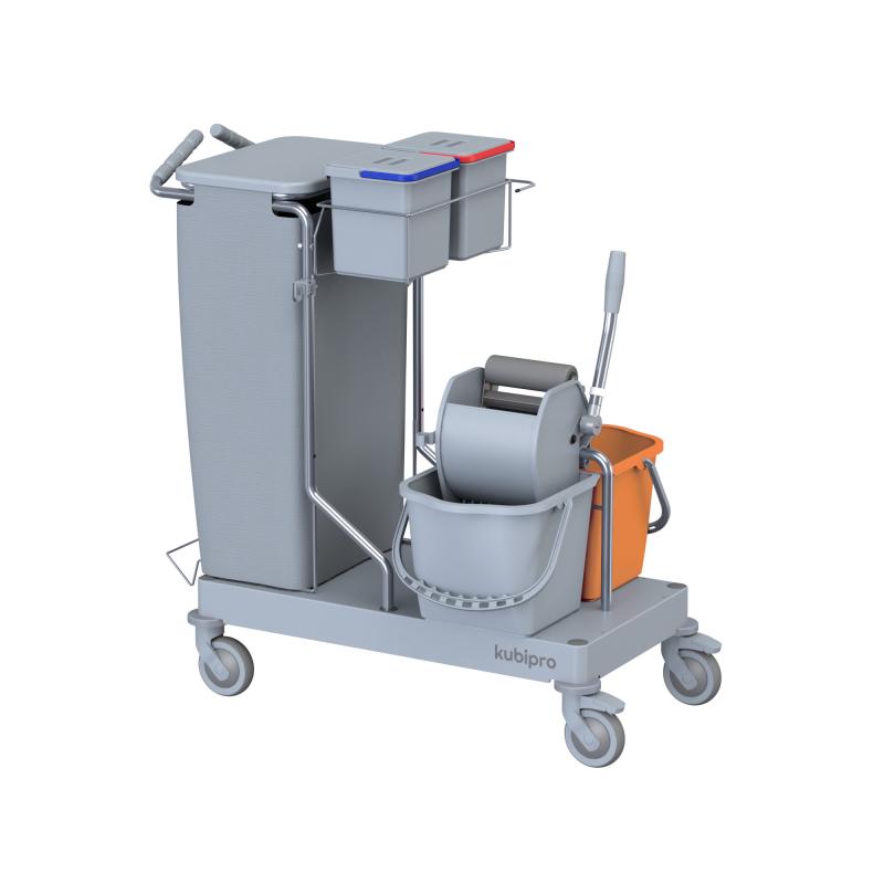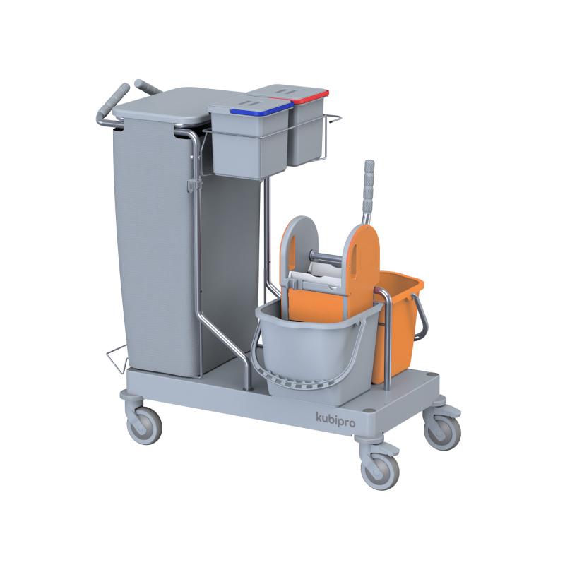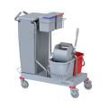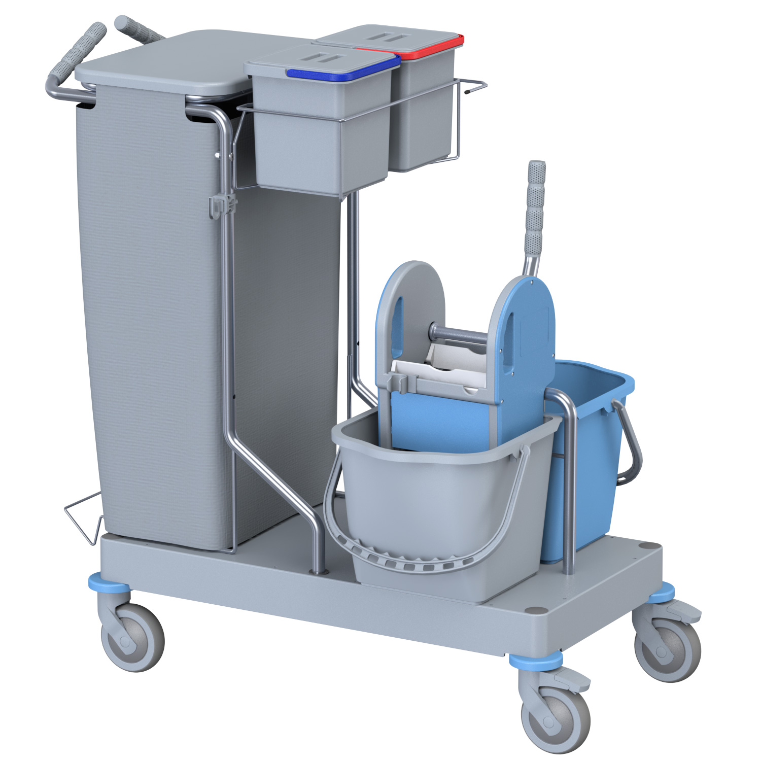 The classic configuration of the community-centre trolley, which can be used for cleaning the floors with traditional washing system or flat washing with roll wringer.
