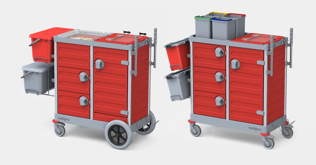 Con i carrelli KUBI-BOX il trasporto di effetti personali può essere separato efficacemente dal materiale di pulizia, grazie ai cassetti montati su guide metalliche con ammortizzatore.