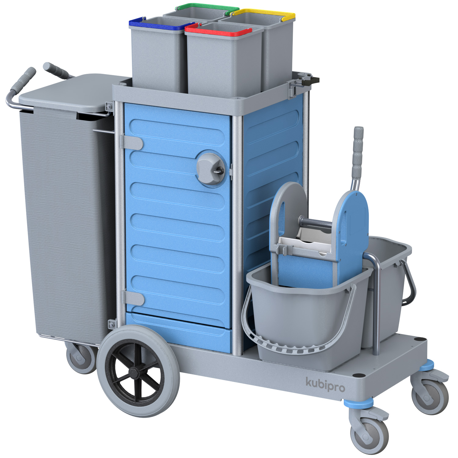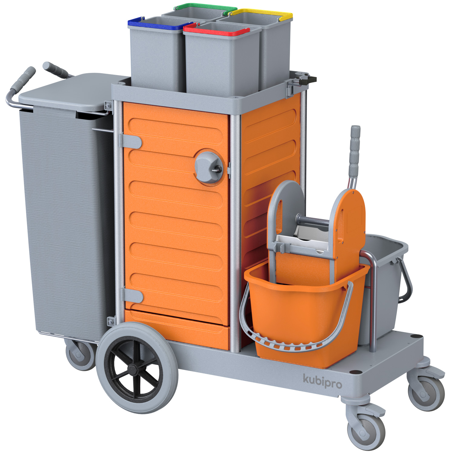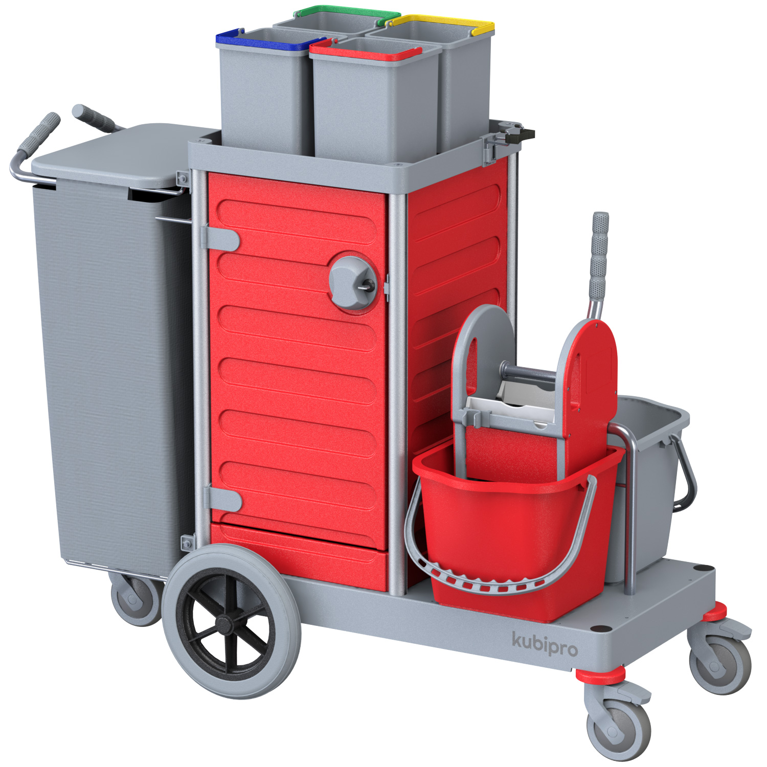 Dotato di serie di sacco in tela con coperchio e di quattro secchi per l’implementazione del codice colore.