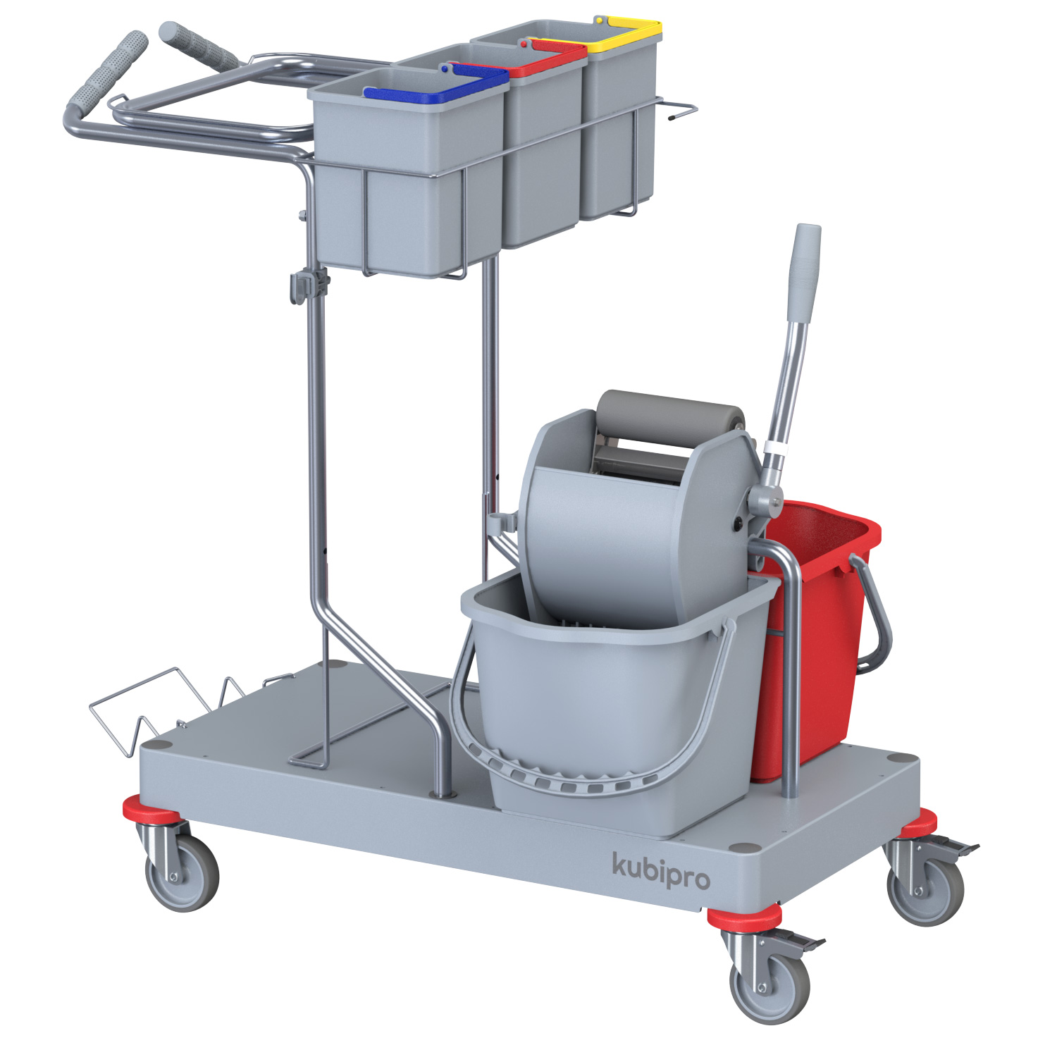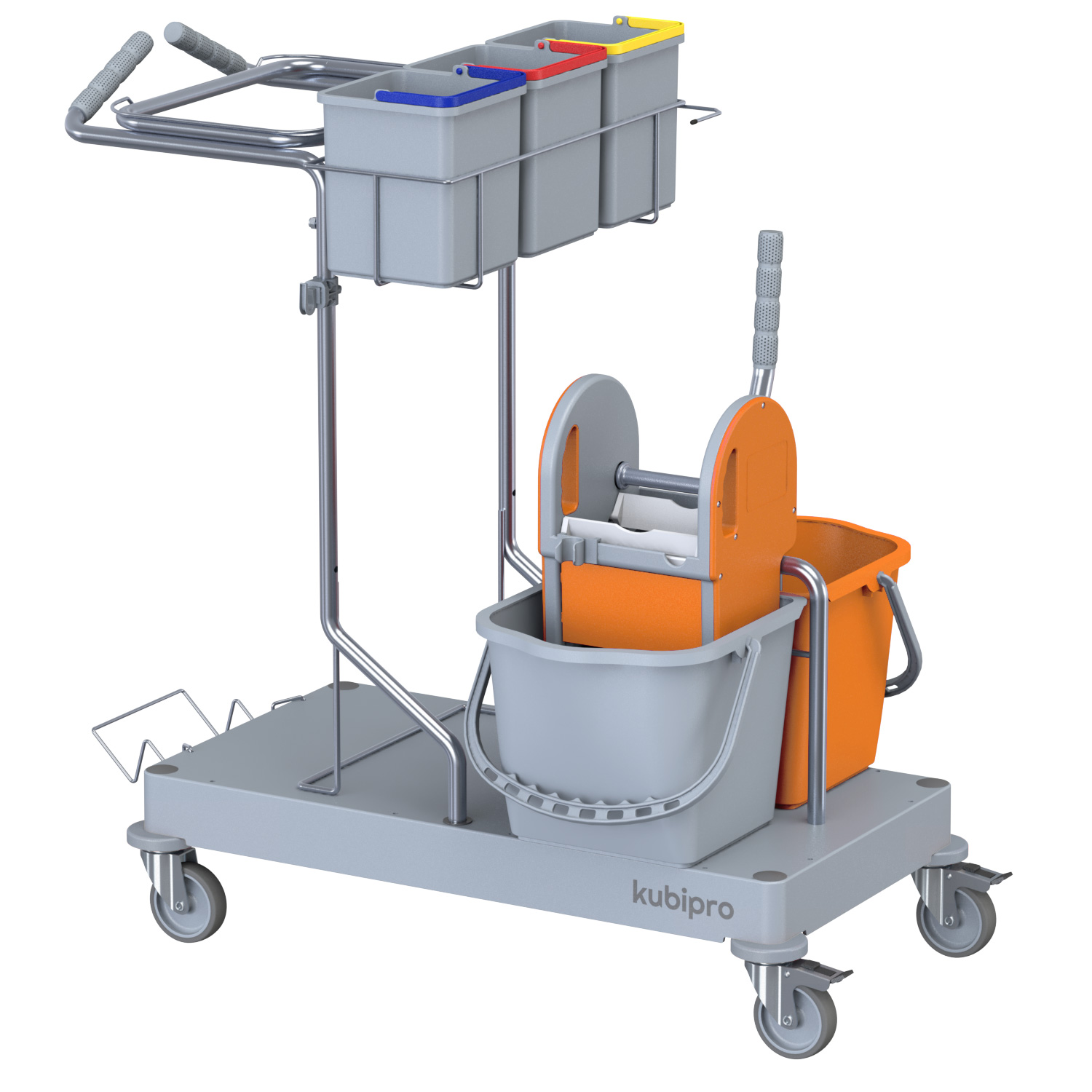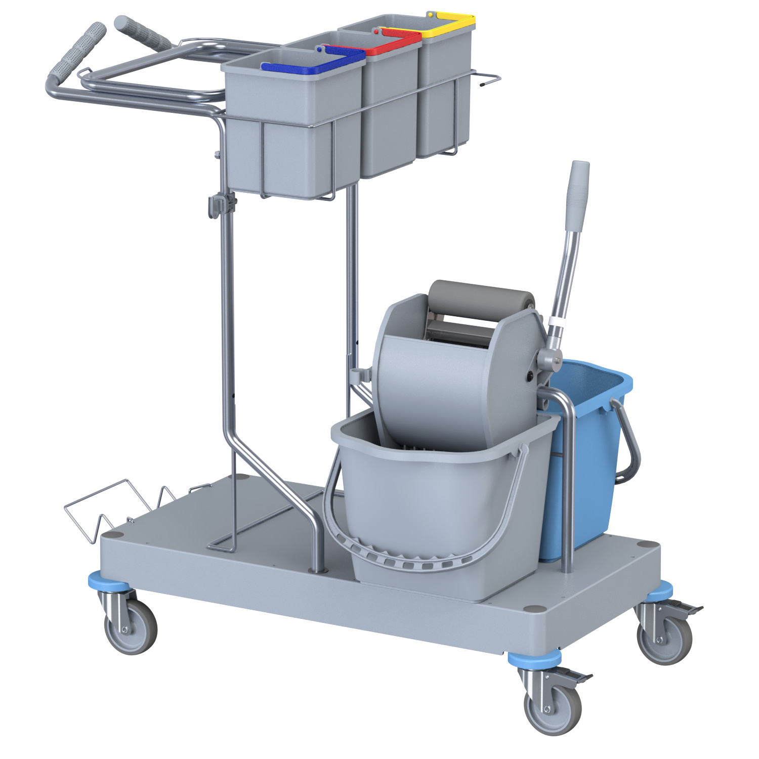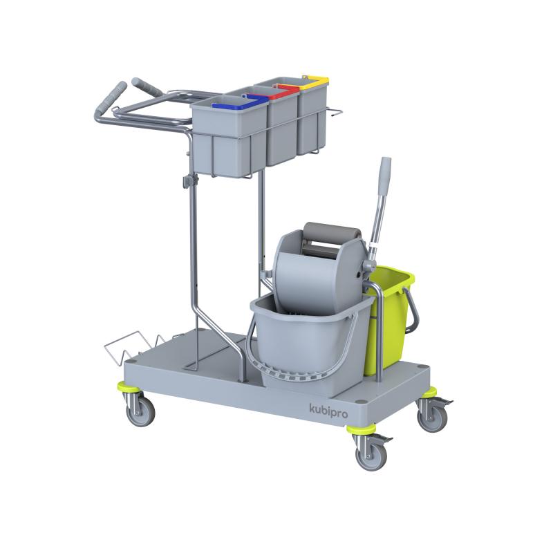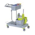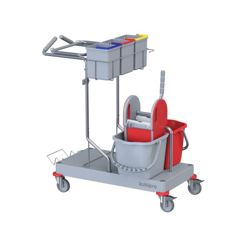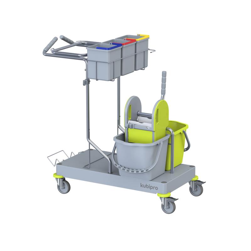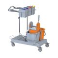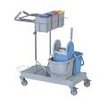 La configurazione classica del carrello per comunità e trova il suo impiego dove sono presenti pavimentazioni da lavare con metodo tradizionale mop o a piatto con pressa a rullo.